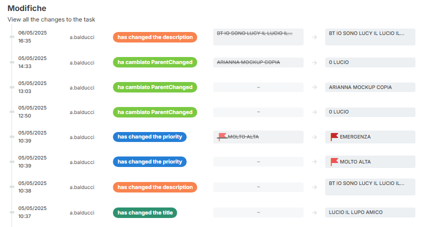 • È stata anche migliorata la gestione delle modifiche multiple. Se una issue/task viene modificata in più punti (es. titolo + descrizione) e salvata, il componente task history recupera e mostra tutte le singole modifiche (es. sia titolo che descrizione)