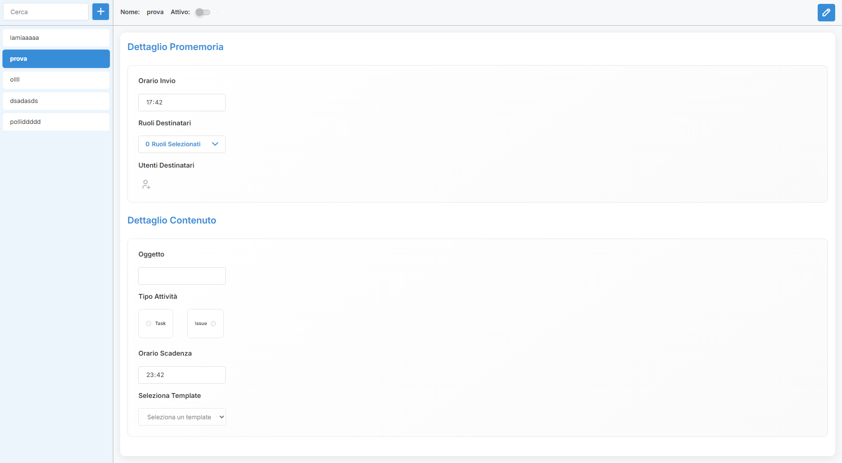 • Campi disponibili: Titolo (obbligatorio), Descrizione (opzionale), Data e ora dell’avviso, Stato: attiva/disattiva senza dover eliminare il promemoria