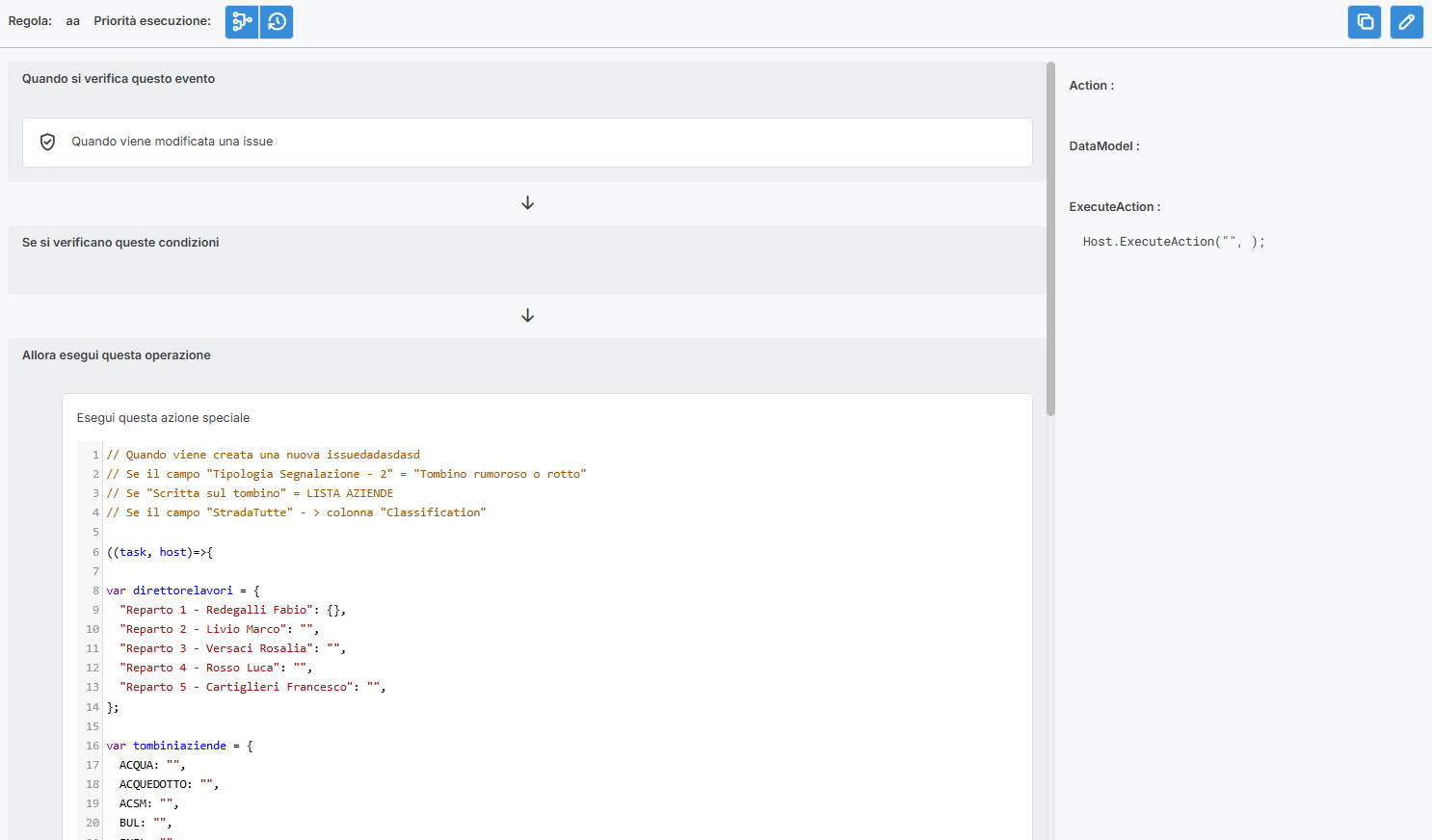 E' stata aggiunta una nuova azione che permette direttamente la scrittura di nuove regole in modalità avanzata con il linguaggio Javascript.