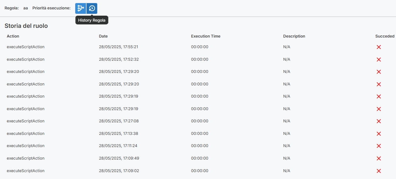 Oltre al nuovo layout in colonna, al pannello laterale di contesto e ai campi Enabled, Order e orderIndex con drag&drop, abbiamo introdotto anche la sezione Storico Regole per tracciare tutte le actions eseguite o in corso.