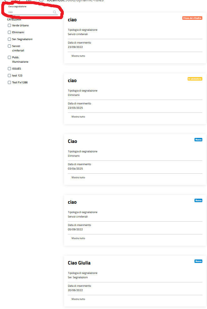 Funzionalità di Ricerca segnalazioni: