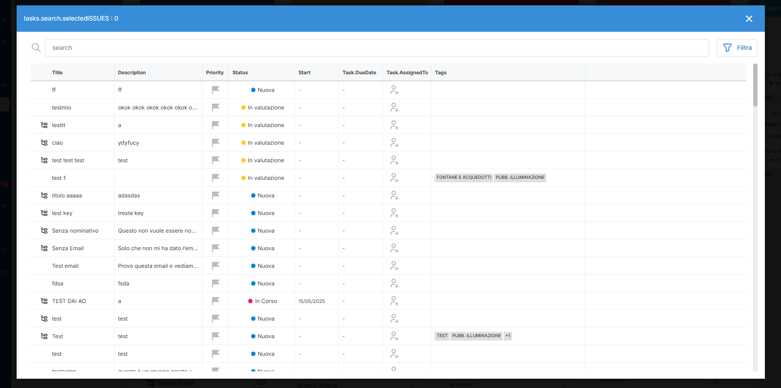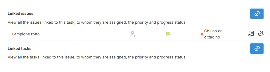 Introdotto un nuovo pulsante “Task collegati” (e “Issue collegati”) direttamente nella modale di dettaglio, per rendere più rapido e intuitivo il collegamento tra task e segnalazioni esistenti.