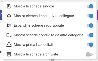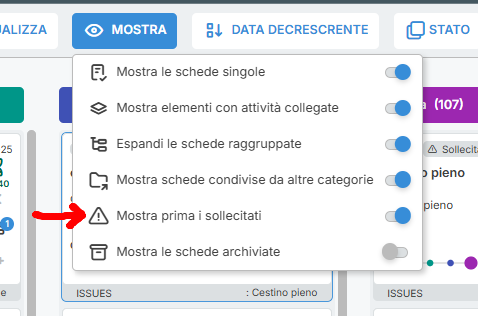E' attivabile dal menù mostra con l'opzione "Mostra prima i sollecitati", in questo caso le card sollecitate verranno sempre posizionate in alto nelle rispettive colonne.