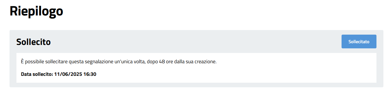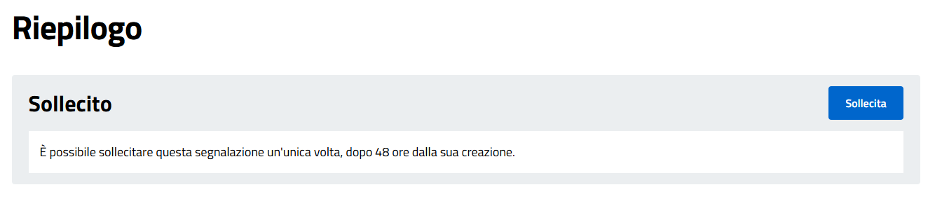 • È possibile effettuare un solo sollecito, dopo N ore (attualmente impostato su 48) dalla creazione della segnalazione.