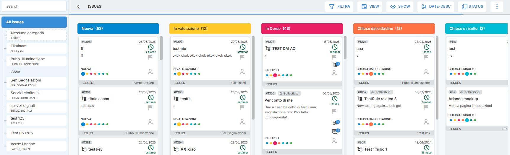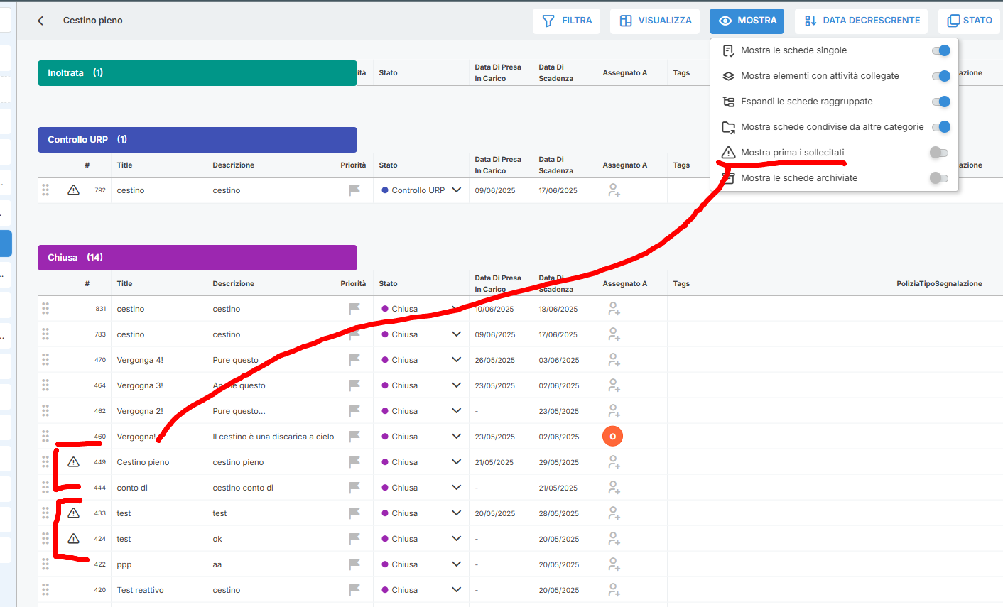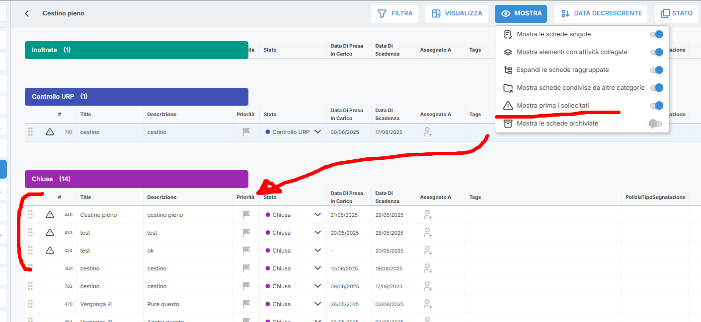 Nella visualizzazione di tutte le segnalazioni è possibile ordinare le segnalazioni sollecitate in modo che queste finiscano in cima alla sezione (colonna se vista kanban o lista se vista lista) corrispondente, indipendentemente dall'ordinamento selezionato. Questo permette di valutare a colpo d'occhio le segnalazioni da attenzionare, perchè sollecitate dal cittadino. Per farlo va abilitata l'opzione corrispondente nel menù "Mostra".