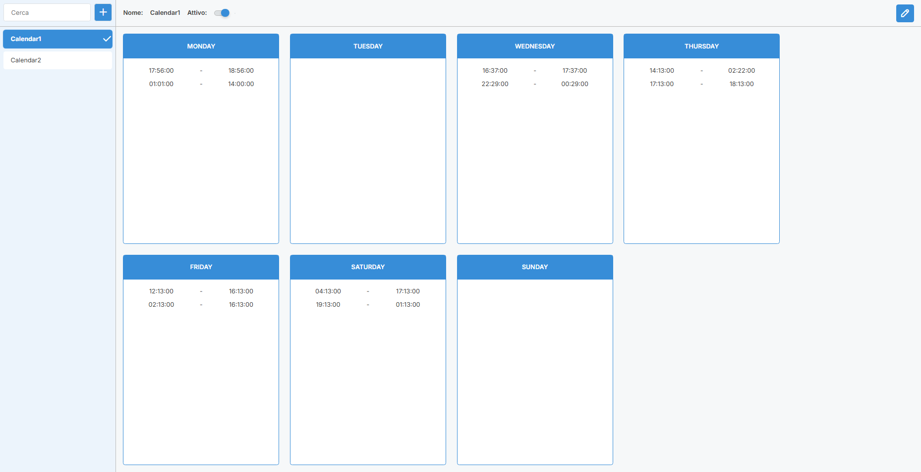 • Ogni calendario ha un badge “Attivo” o “Inattivo” che indica se è in uso nelle pianificazioni.