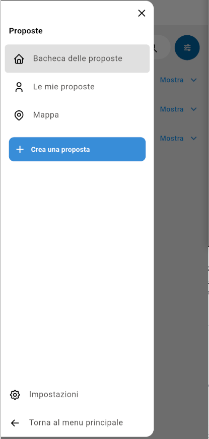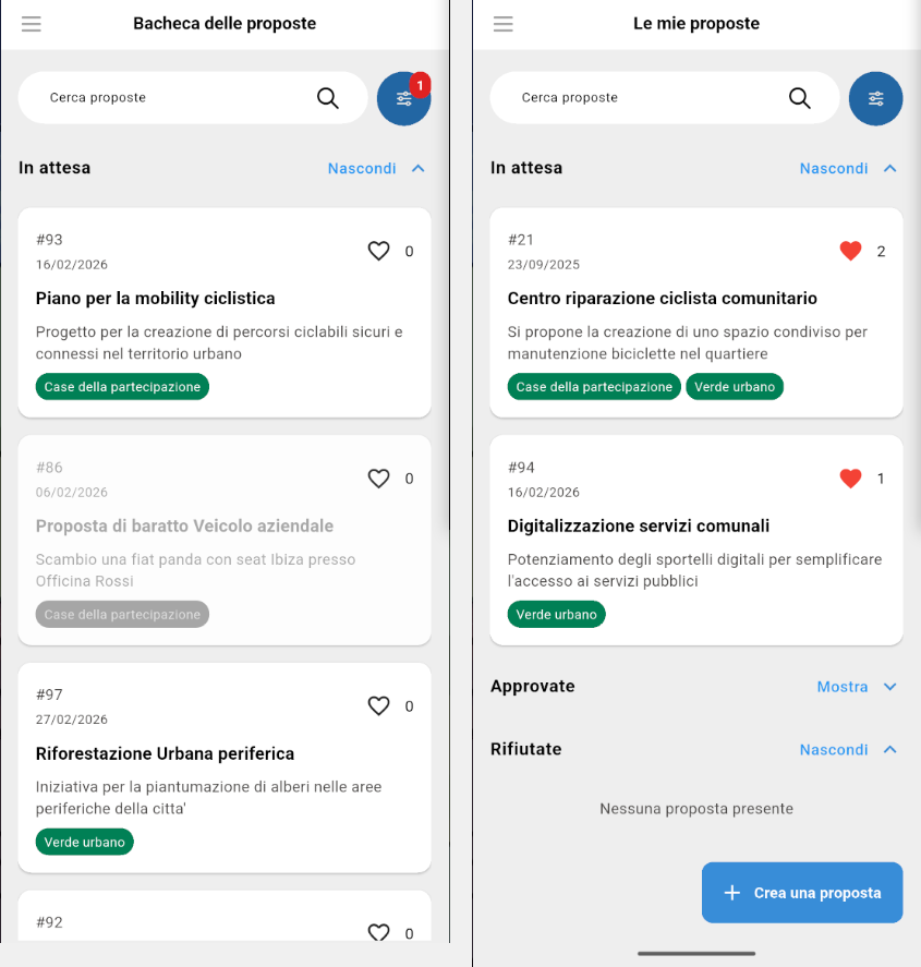 La bacheca è la schermata principale del modulo e mostra tutte le proposte disponibili (eccetto le proprie), raggruppate per stato. È accessibile a tutti gli utenti dell'app e rappresenta il punto di ingresso principale per la consultazione delle proposte della comunità.
