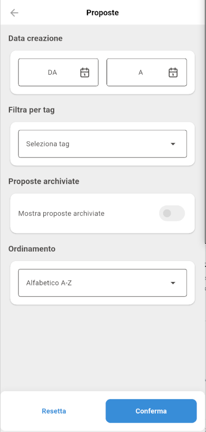 Il pannello dei filtri è accessibile tramite il pulsante con l'icona di regolazione presente nella barra di ricerca. Permette di affinare la visualizzazione delle proposte in base a criteri multipli. In fondo al pannello sono presenti due pulsanti: Resetta per ripristinare tutti i filtri ai valori predefiniti, e Conferma per applicare la selezione corrente.