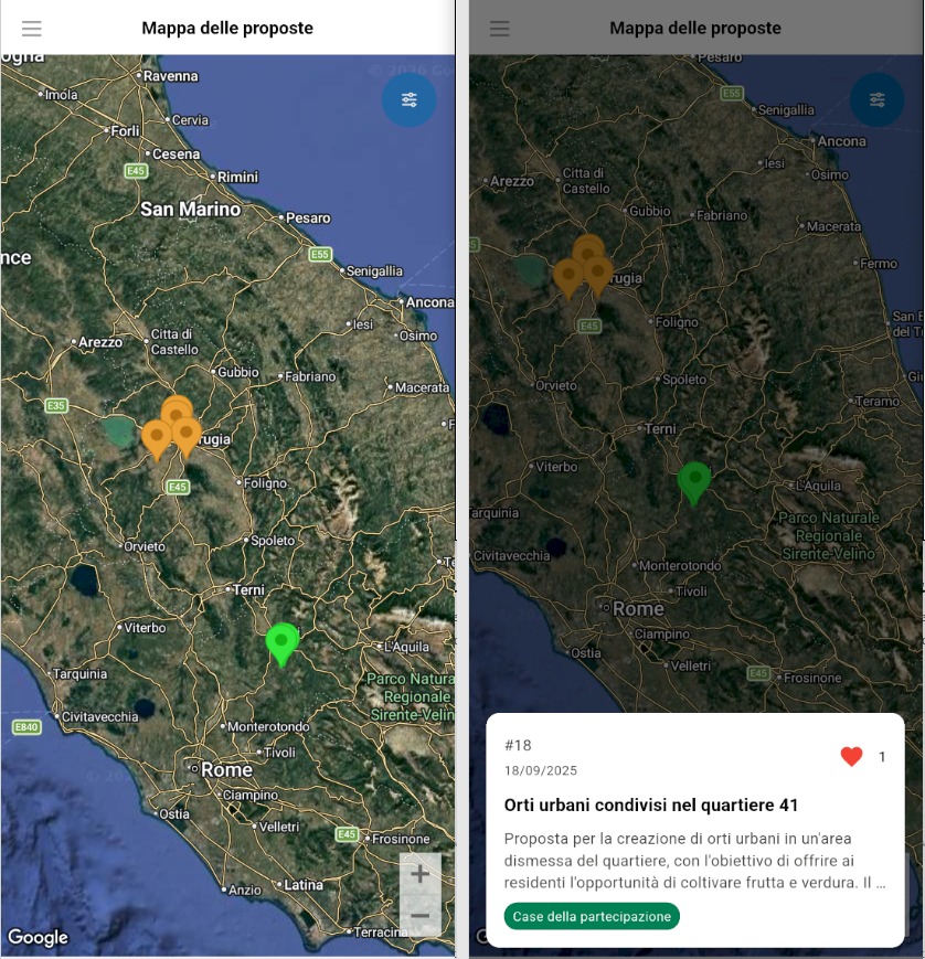 La mappa offre una visualizzazione geografica interattiva delle proposte. Ogni proposta con una posizione associata appare sulla mappa come un marker colorato. Il colore del marker indica lo stato della proposta. Toccando un marker sulla mappa si apre una card informativa nella parte inferiore dello schermo.