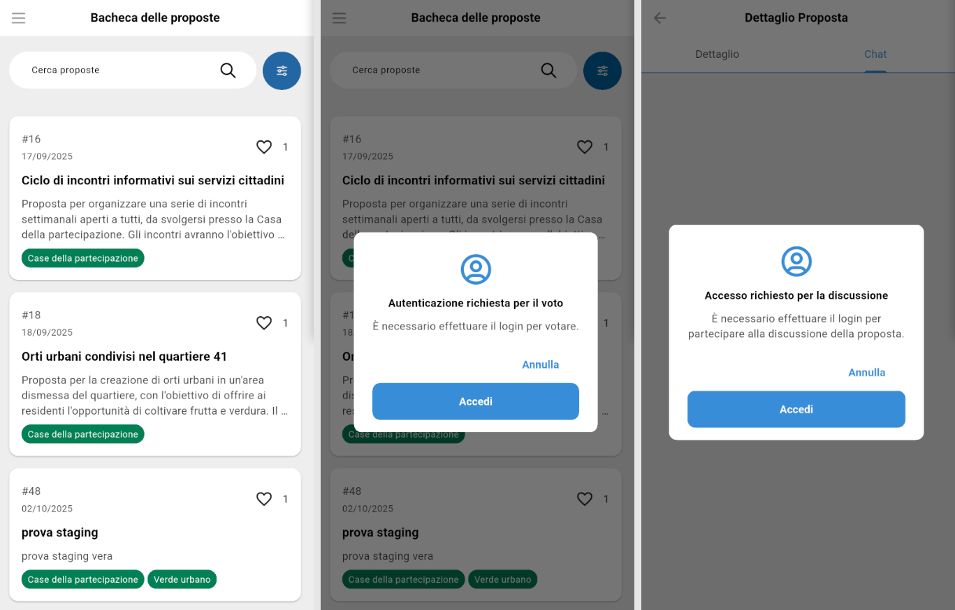 L'utente non autenticato può navigare liberamente tra le proposte e accedere al dettaglio di ciascuna. Tuttavia, alcune funzionalità sono vincolate all'autenticazione: