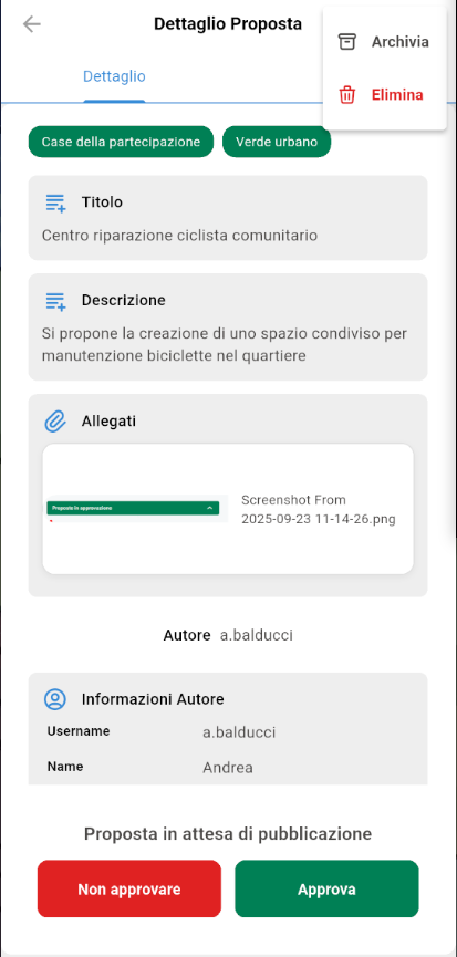 La schermata di dettaglio mostra tutte le informazioni di una proposta e, per gli utenti con privilegi di moderazione, include le azioni di approvazione, rifiuto, archiviazione ed eliminazione, visualizzazione informazioni autore.
